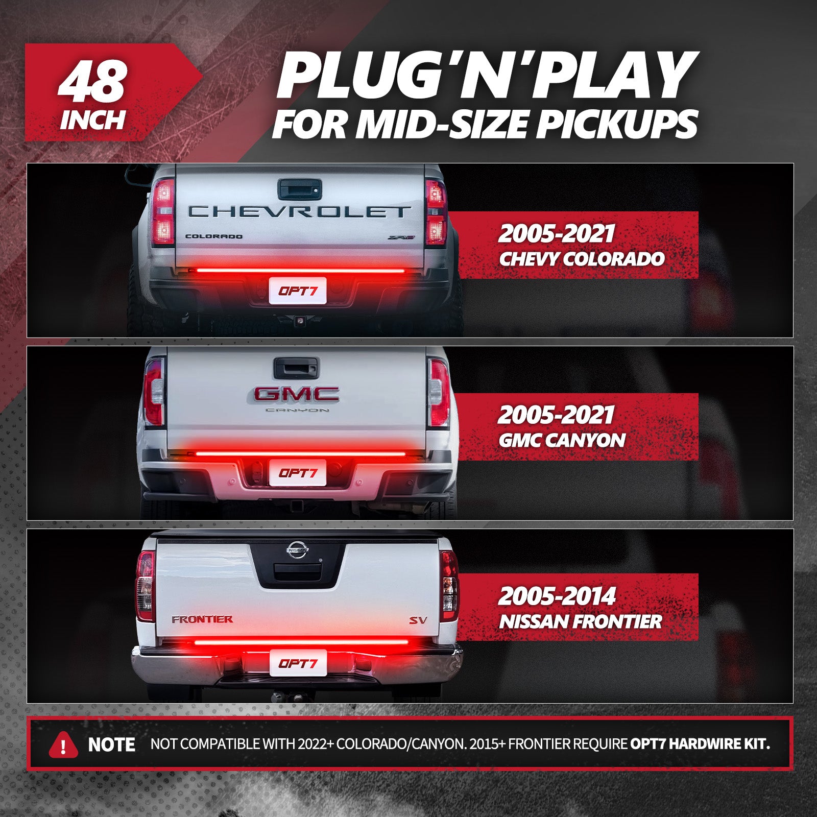 Spare Tire Access Port Accessibility Fitment for the Redline Triple LED is based on the amount of Tailgate's available flat surface length-wise. If your vehicle has 48" of available space length-wise across the tailgate then the 48" version will fit nicely. If you have 60" of available space length-wise across the tailgate then the 60" version should be purchased.