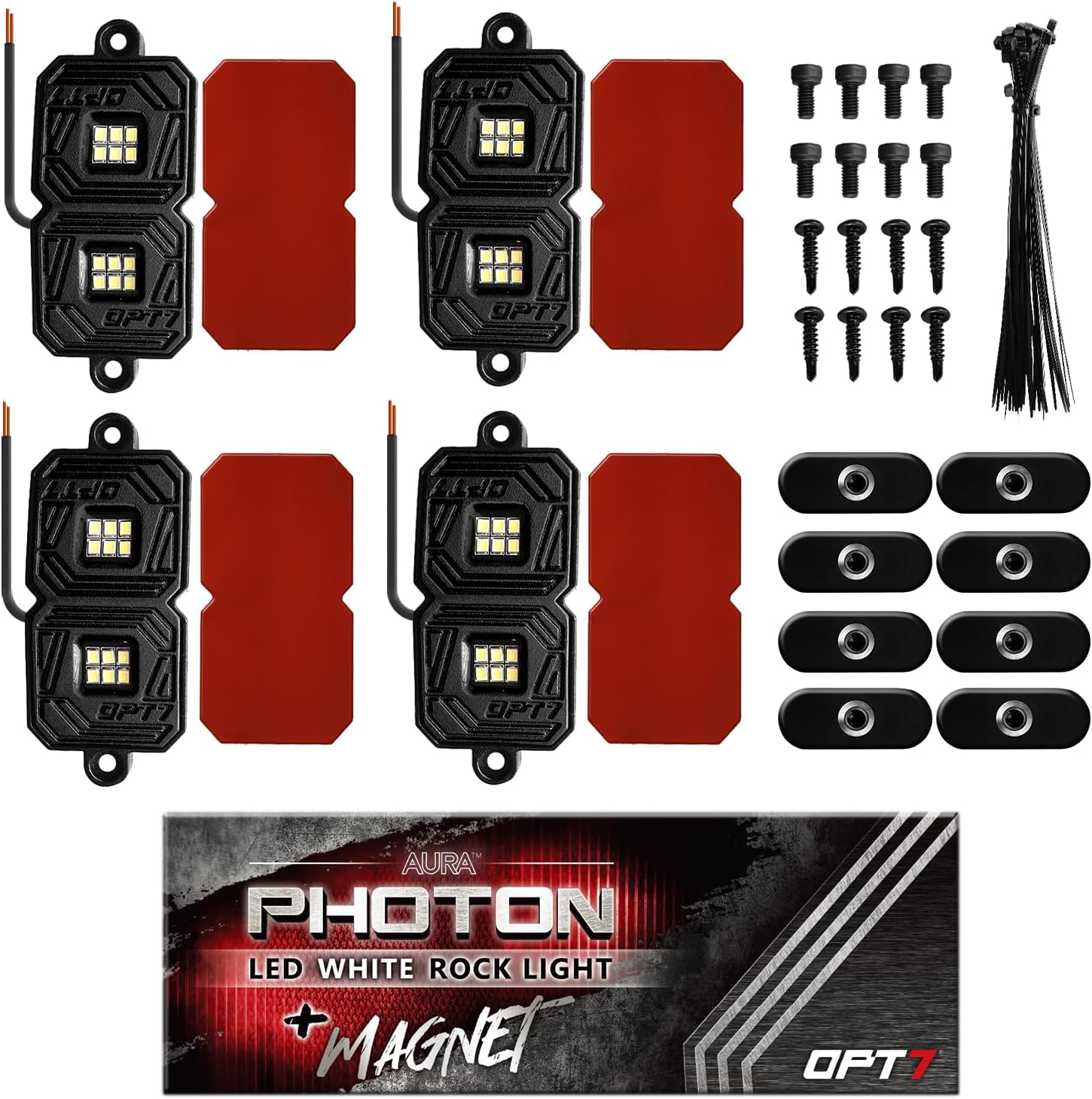 The OPT7 Off-Road Experience These exclusive Rock Lights have been engineered by the OPT7 Team to take your off-road experience to a new era. Designed specifically for extreme terrain, the Photon LED Rock Lights are the next evolution in our off-road product line. The magnet installation method provides you with the easiest way to mount the pods to anywhere you like. Multiple color options illuminate over 10 square feet making sure that your rig is equipped with unmatched style on and off the road.