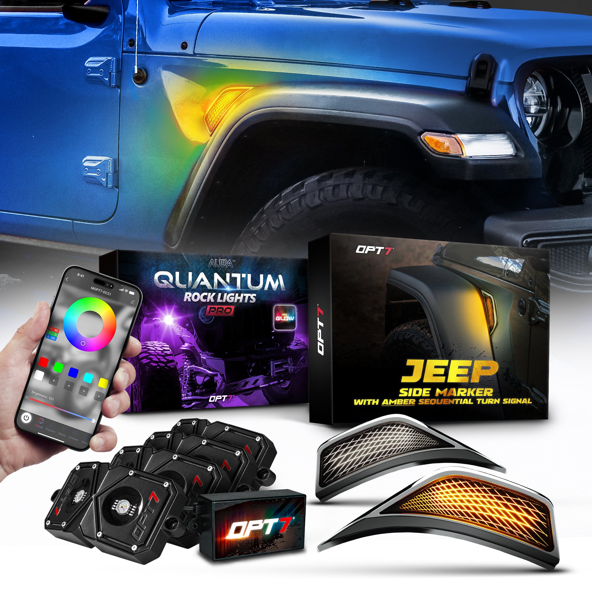 Installation Guide. AURA PRO™ Quantum Rock Lights - RGBW with Bluetooth APP & Remote Control Installation Guide - Here AURA PRO™ OPT7 GLOW Application User Guide - Here 2018-2023 Jeep Wrangler JL & Gladiator JT - Front Fender Side Marker LED White/Amber Light - Installation Guide - Here CA Residents: WARNING: Cancer and Reproductive Harm - www.P65Warnings.ca.gov
