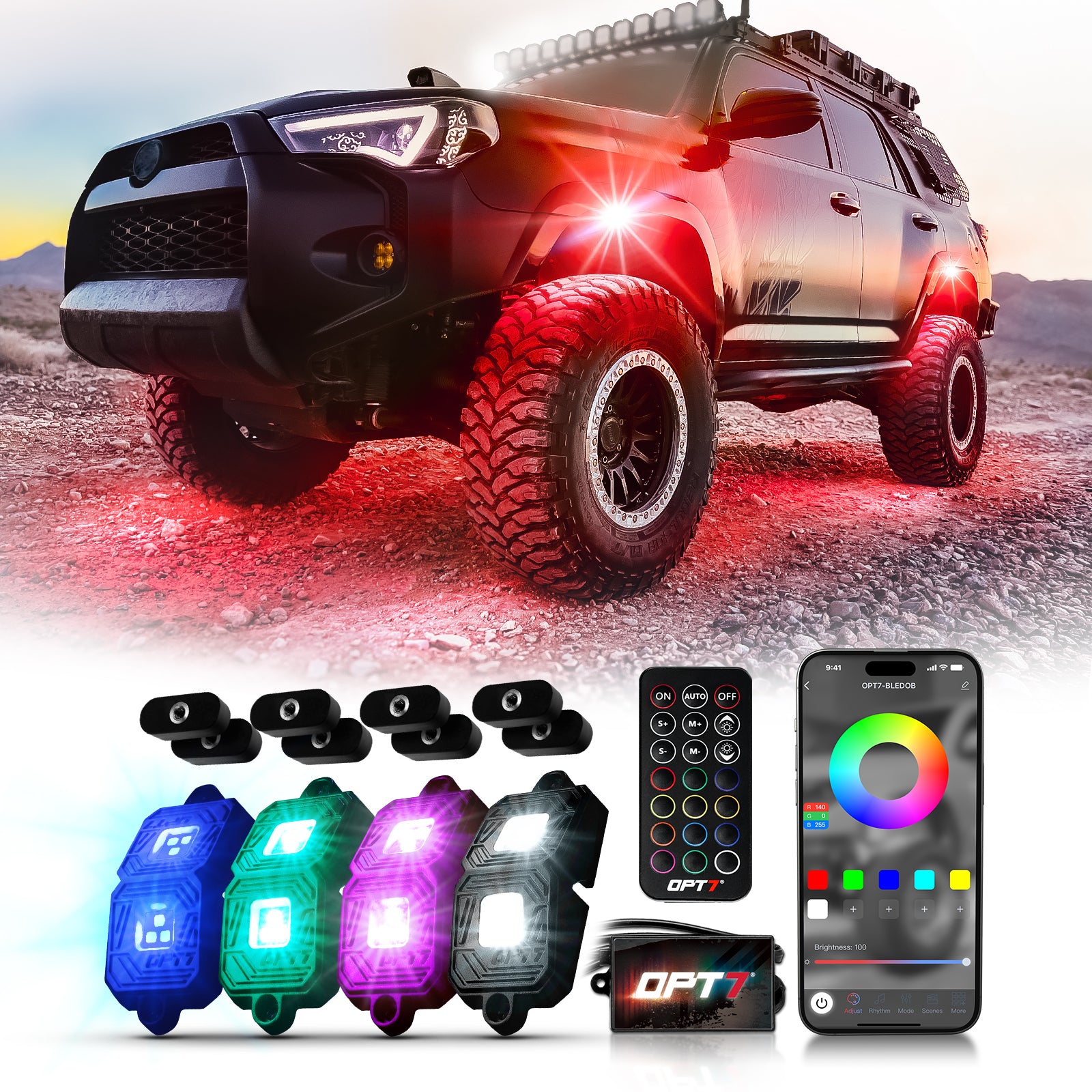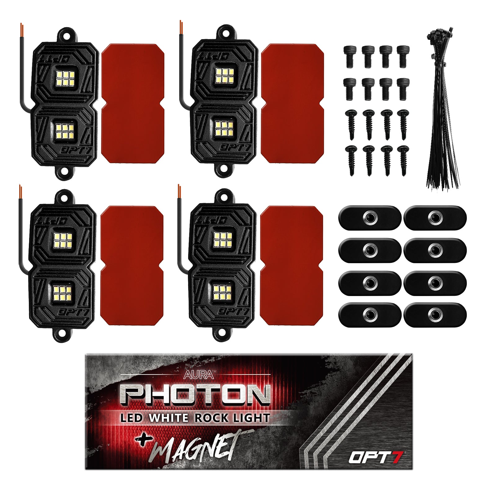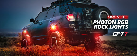 The OPT7 Off-Road Experience These exclusive Rock Lights have been engineered by the OPT7 Team to take your off-road experience to a new era. Designed specifically for extreme terrain, the Photon LED Rock Lights are the next evolution in our off-road product line. The magnet installation method provides you with the easiest way to mount the pods to anywhere you like. Multiple color options illuminate over 10 square feet making sure that your rig is equipped with unmatched style on and off the road.