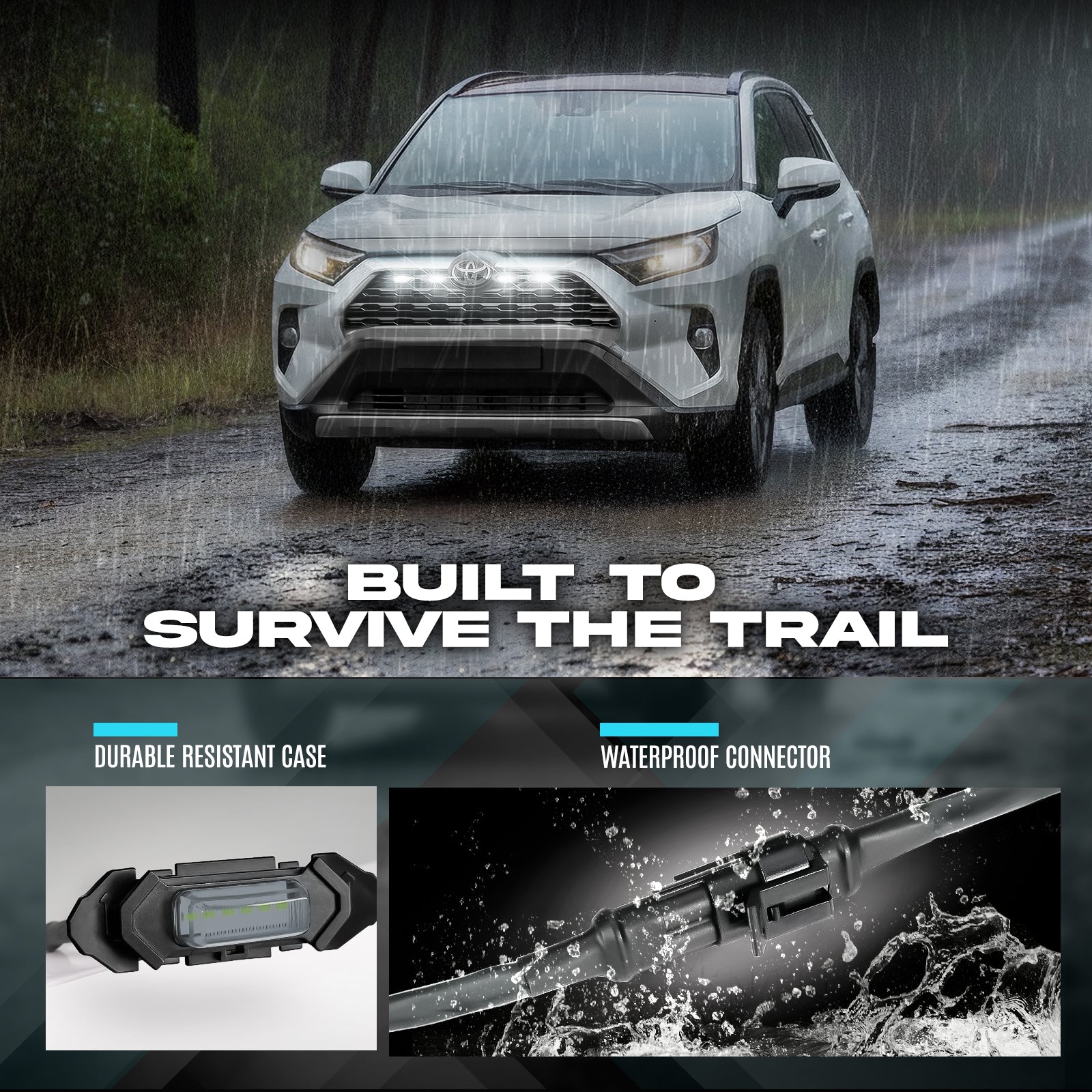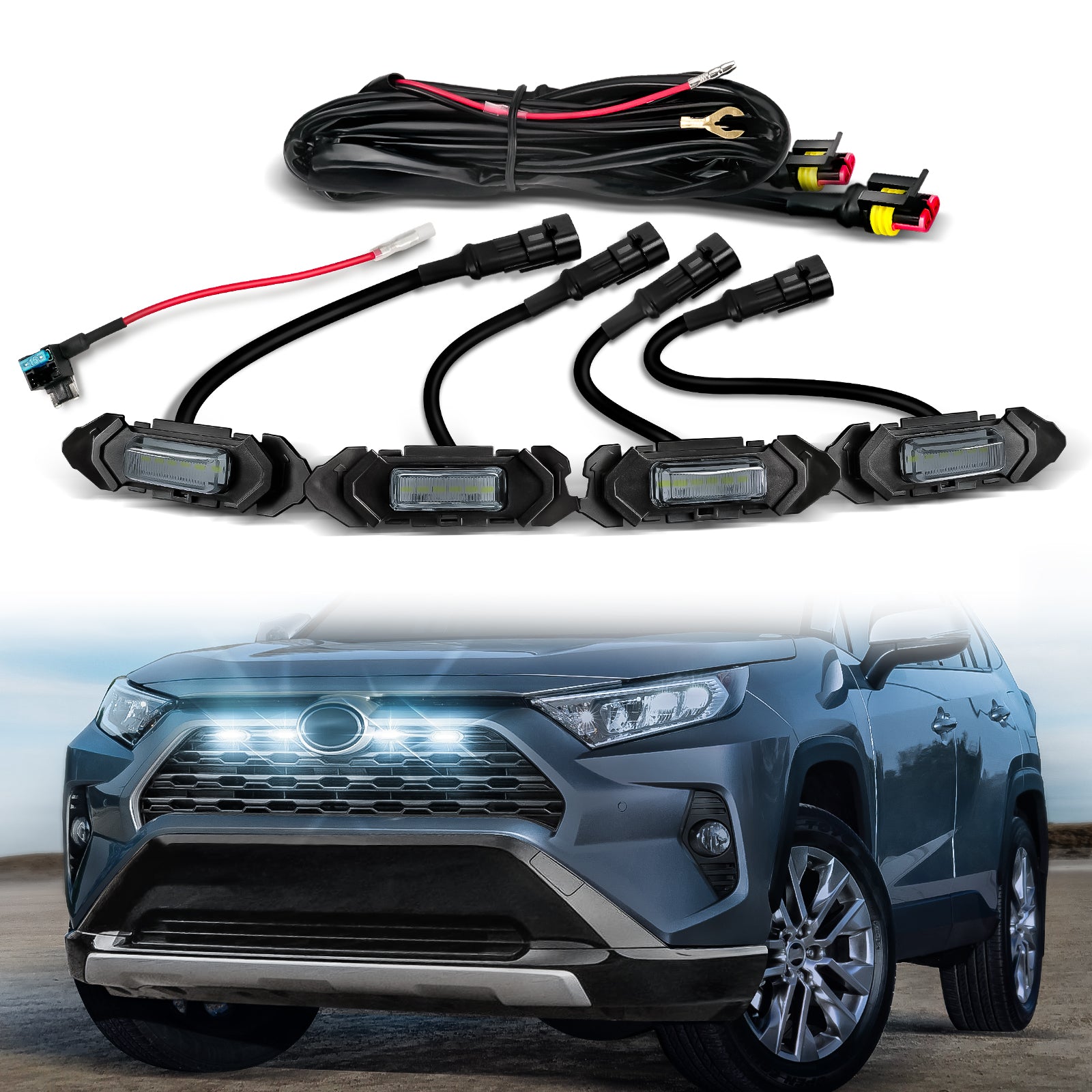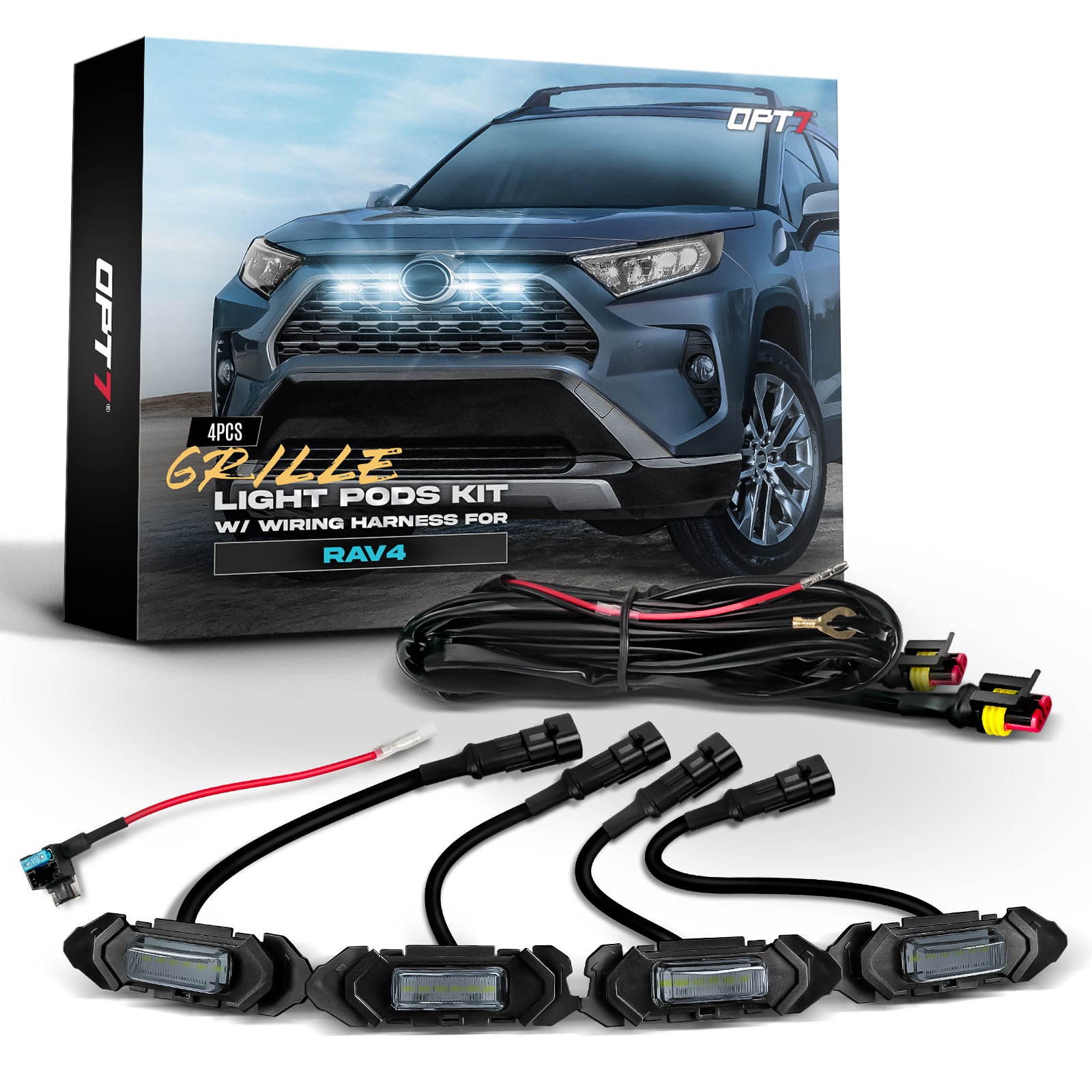 White LED Grille Lighting Kit for 2019-2025 Toyota RAV4 5th Gen Upgrade the front end of your 2019-2025 Toyota RAV4 with the OPT7 White LED Grille Lighting Kit. Designed specifically for the 5th generation RAV4, these bright LED grille lights deliver a modern DRL-style accent while improving visibility during low-light conditions.