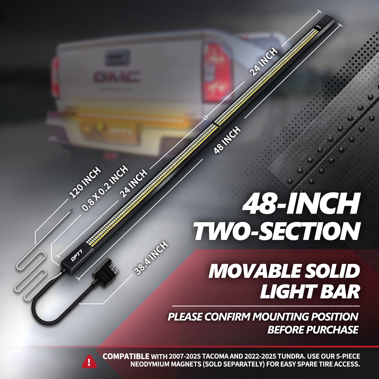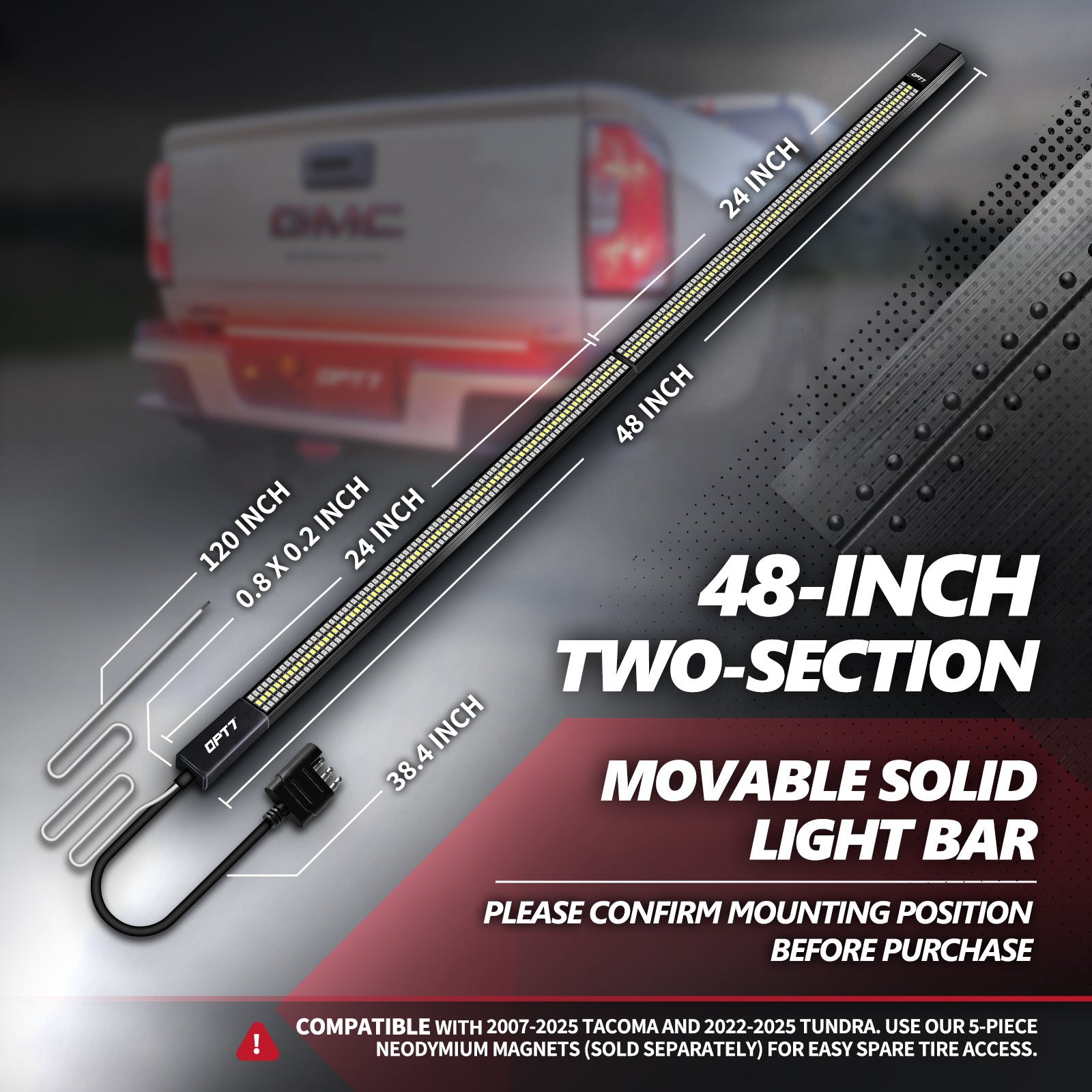 Spare Tire Access Port Accessibility Fitment for the Redline Triple LED is based on the amount of Tailgate's available flat surface length-wise. If your vehicle has 48" of available space length-wise across the tailgate then the 48" version will fit nicely. If you have 60" of available space length-wise across the tailgate then the 60" version should be purchased.